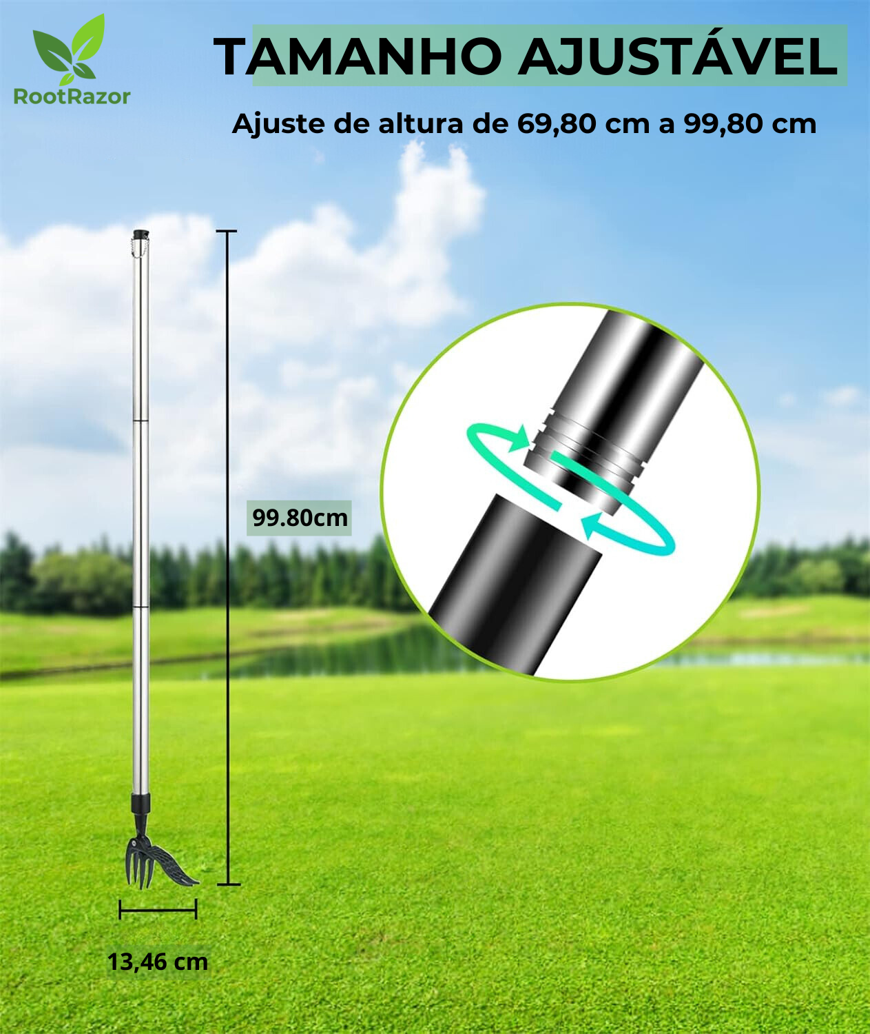 Conheça o RootRazor: o herói do seu jardim. Esqueça o desconforto de se curvar e a tensão nas costas e nos joelhos. Nossa ferramenta altamente eficiente foi projetada para que você possa arrancar ervas daninhas facilmente em pé, graças à sua alça ajustável que se adapta perfeitamente à sua altura.