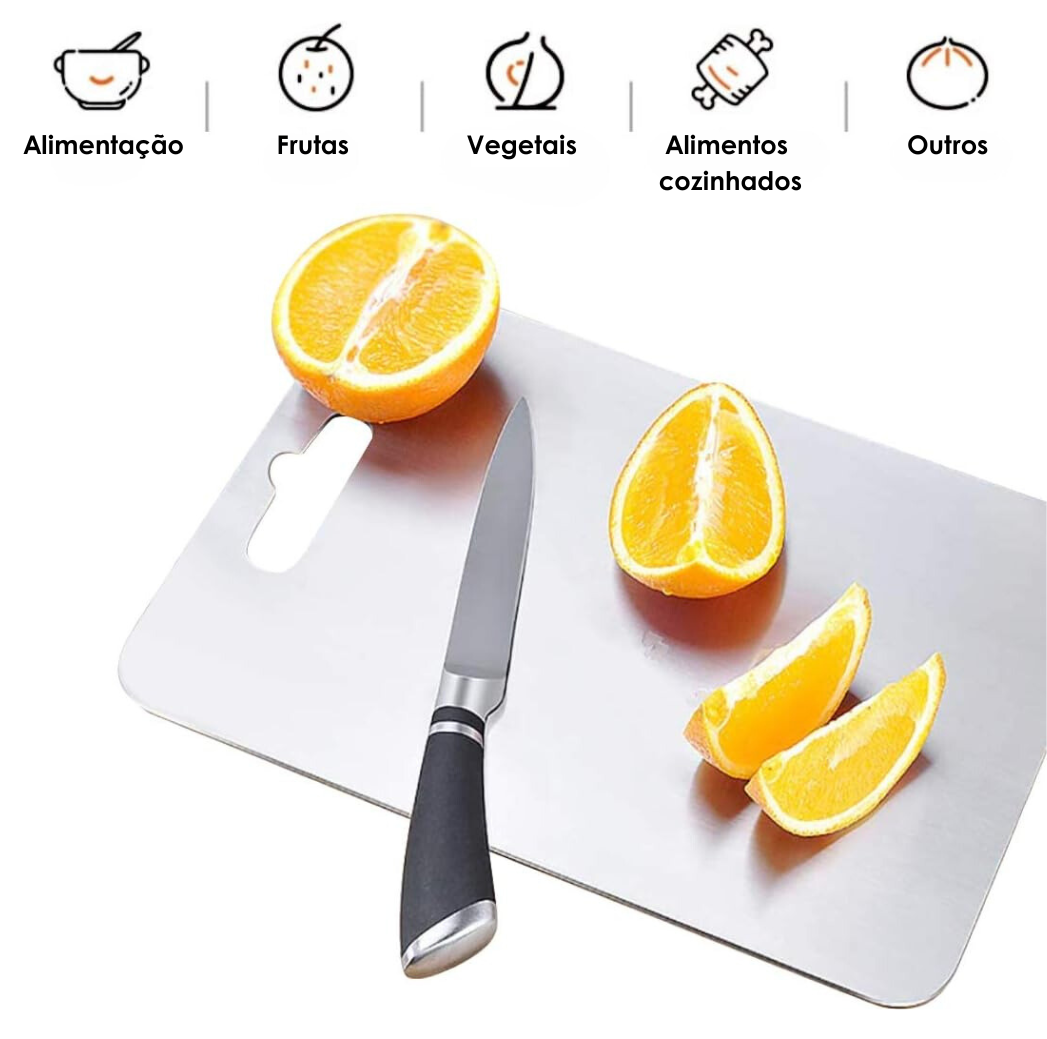 Com a Tábua de Corte Inoxidável, você terá uma superfície de corte dupla face que não só facilita a preparação dos alimentos, mas também proporciona uma cozinha mais higiênica e livre de germes. É fácil de limpar, basta passar um pano ou lavar com água e sabão. Perfeita para qualquer tipo de alimento, desde carnes até vegetais.
